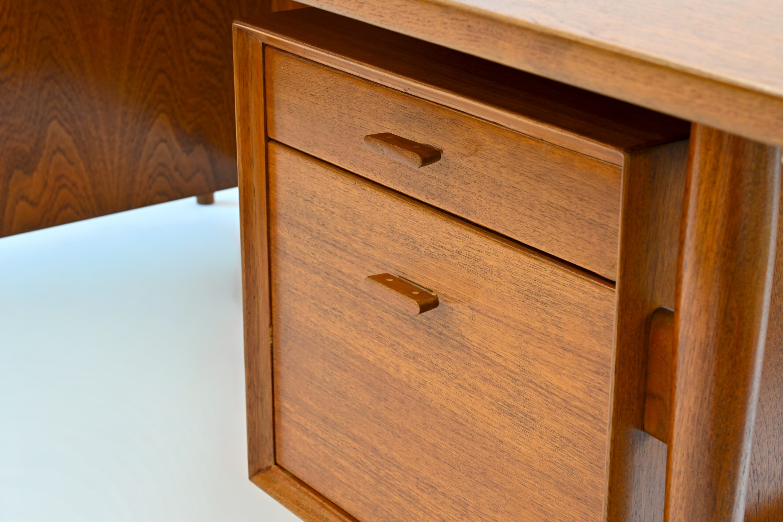 Ses buffets, bureaux et tables privilégient des formes douces et fonctionnelles.